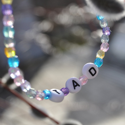 Pärlat armband med bokstavspärlor och färgglada pärlor med förkortningen T.A.D som står för "Together against diabetes".